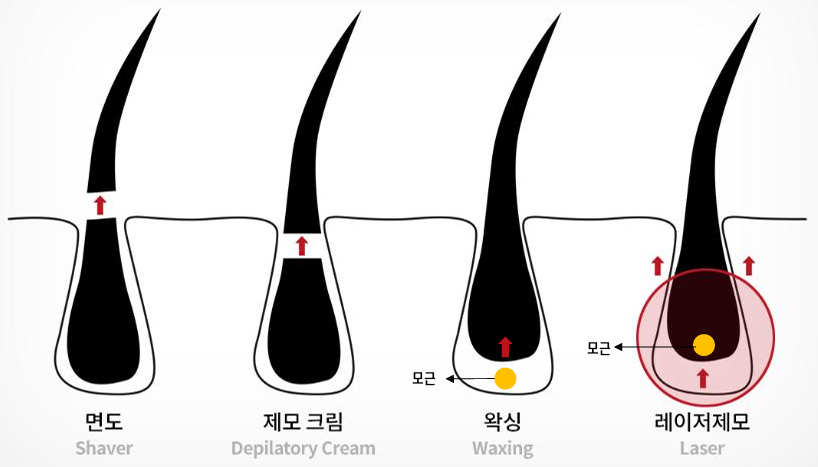 레이저 제모는 레이저 열 확산을 이용해 모낭을 파괴하는 방식입니다. 까만색 털에 레이저가 반응하여 열을 발생시키고, 이 열이 털 뿌리까지 도달하여 털의 재생을 반영구적으로 막습니다. 유지 기간 면에서 왁싱과 큰 차이를 보이며, 유지기간이 긴 장점이 있습니다.