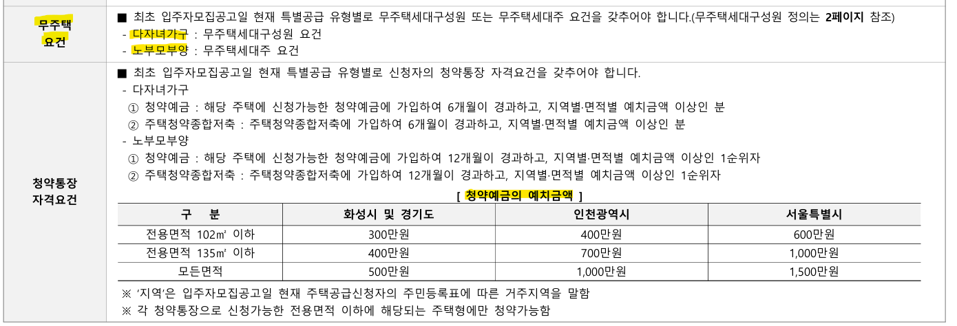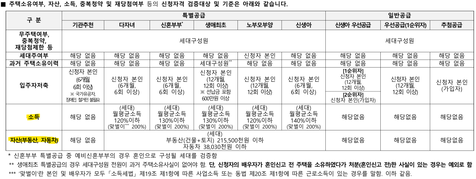 국민주택은 무주택 세대 구성원이어야 합니다. 그리고 특별공급 유형별 신청 자격은 다음의 이미지 참고 부탁드리며 민영 주택과 다른 점은 국민주택은 소득과 자산요건까지도 심사를 합니다.