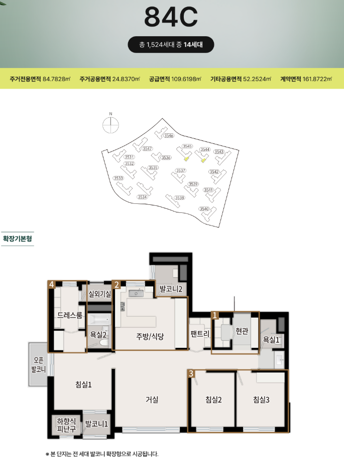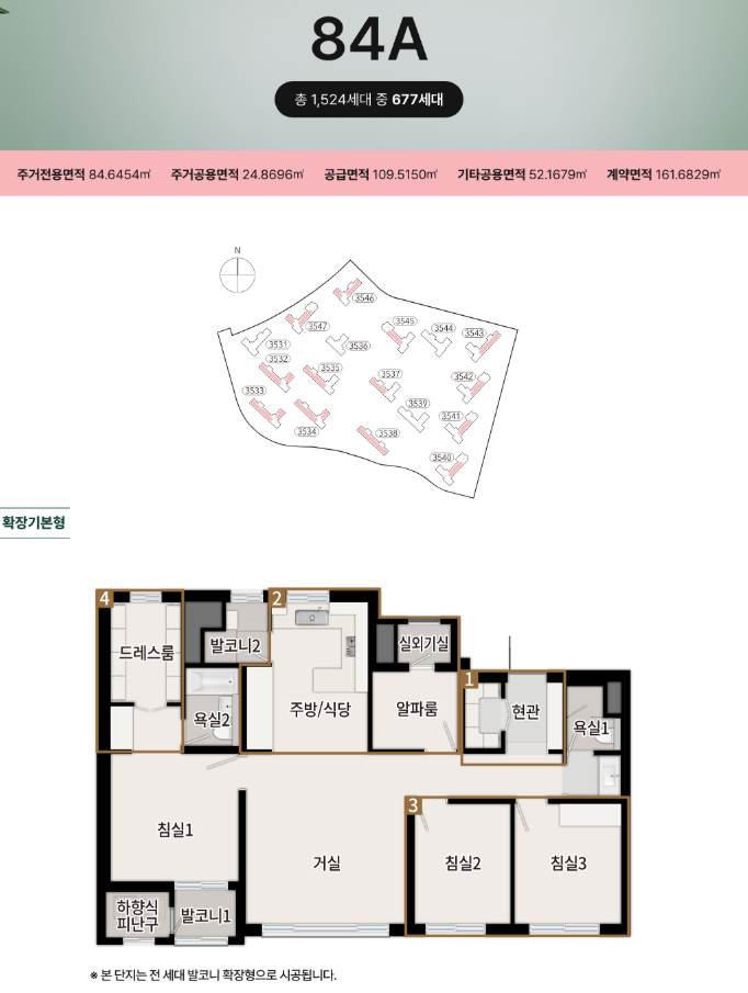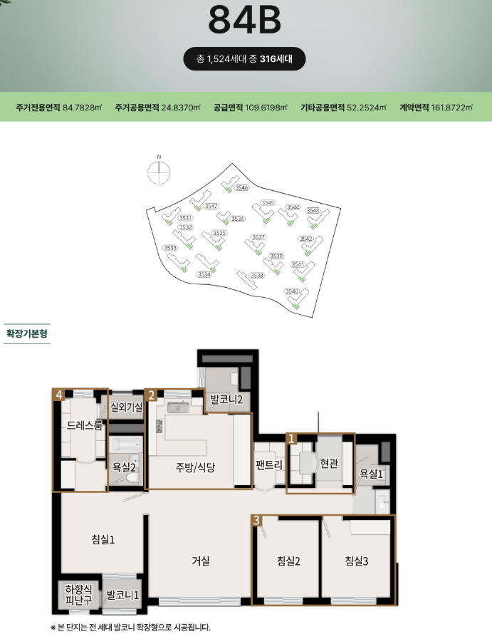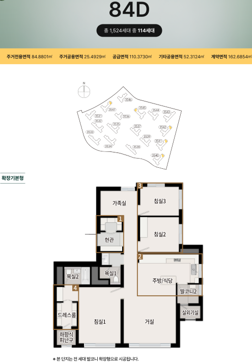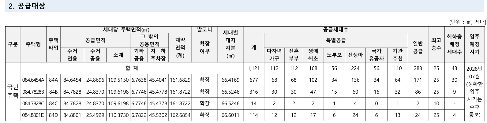 - 국민 주택: 1,524 세대 중, 전용 84㎡부터 이하인 1,121세대가구