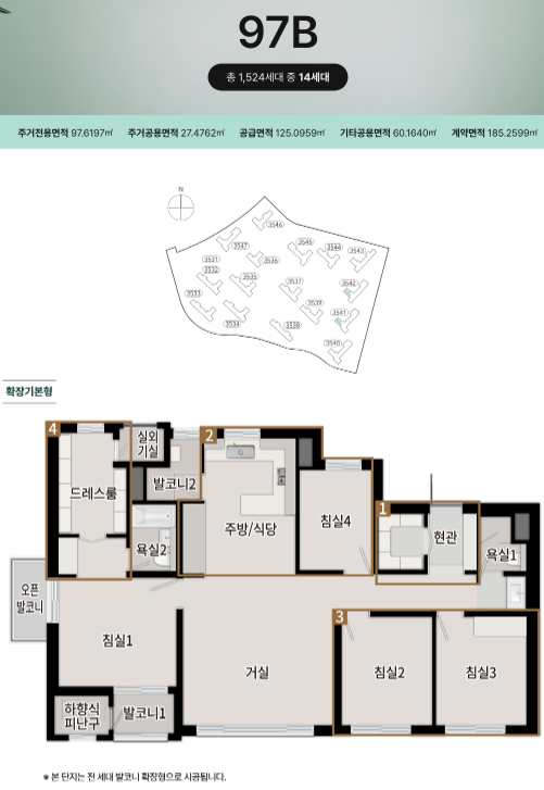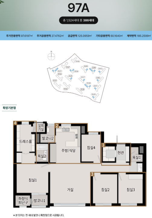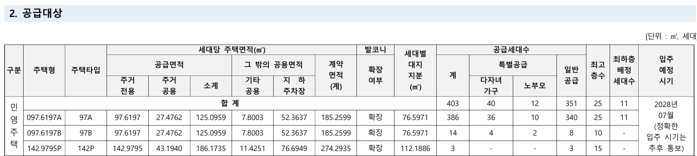 - 민영 주택: 전용 84㎡초과 인 403세대 공급(97㎡ 400세대 / 142㎡ 3세대)