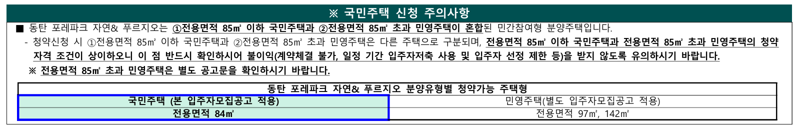 이 단지는 위에서 말씀드린대로 국민주택과 민영주택 두 가지 버전으로 나뉘어 청약이 진행됩니다. 민간참여 공공분양 아파트로, 모집공고를 보면 전용면적에 따라 국민과 민영으로 구분됩니다. 각 국민
