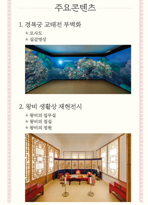 교태전의 마지막 순서인 부속전각 건순각 내부도 이번 30주년을 맞아 처음 공개됩니다!! 부벽화 속 동물을 다룬 실감영상을 감상하고, 디지털 체험도 가능한 특별 공간으로 되어 있으므로 연인, 가족 등 다양한 세대가 방문해서 돌아보기 좋습니다.