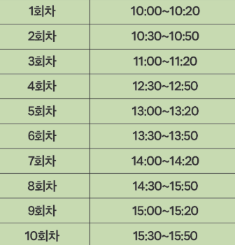 - 운영시간: 오전 10시 ~ 오후 4시 / 아래 회차별로 각 20분씩 관람 가능